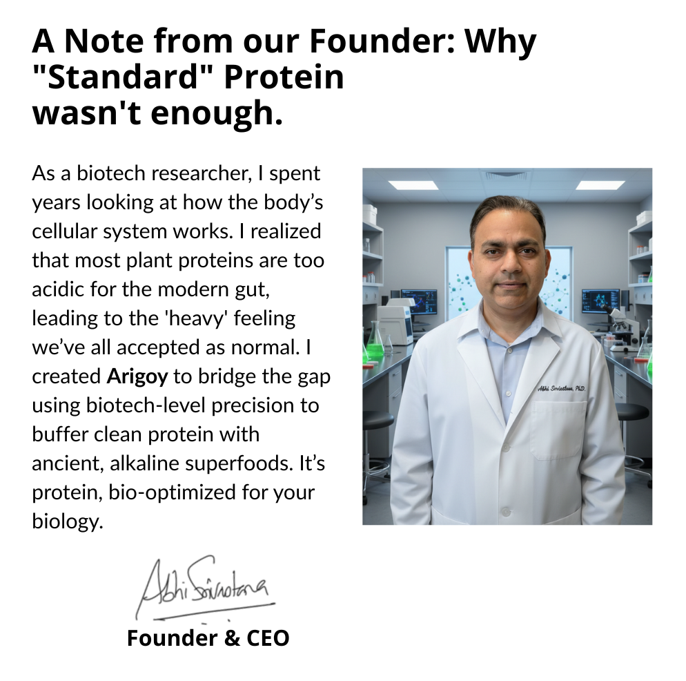 The Arigoy Matrix combines Plant Protein, Makhana (Water Lily Seed), and Ashwagandha into a bio-optimized scaffold.