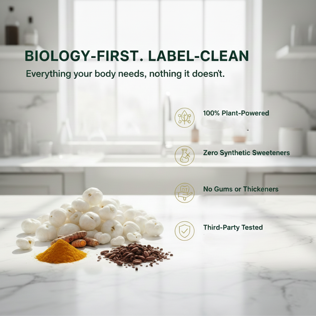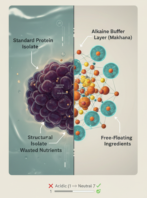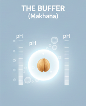 Makhana (Water Lily Seed) naturally alkaline to neutralize the acidity of standard proteins, eliminating gas and heaviness.