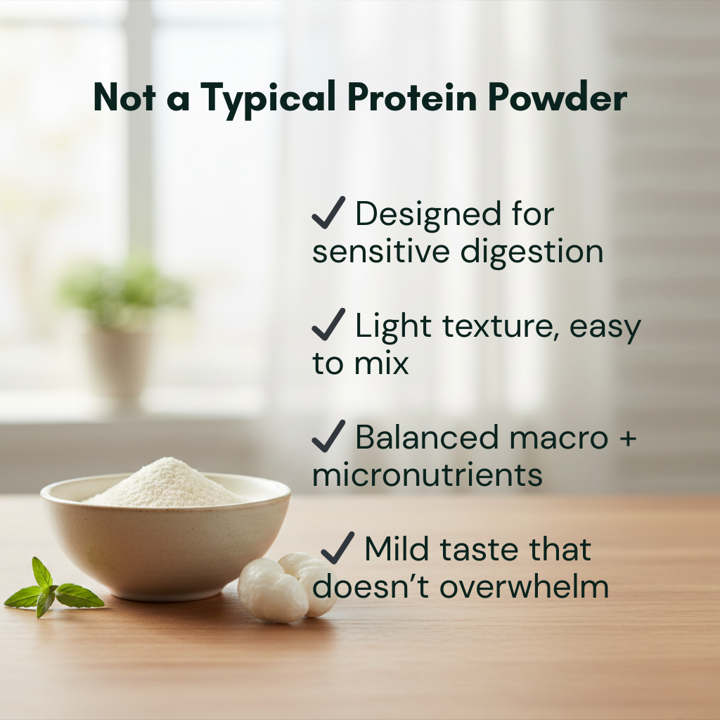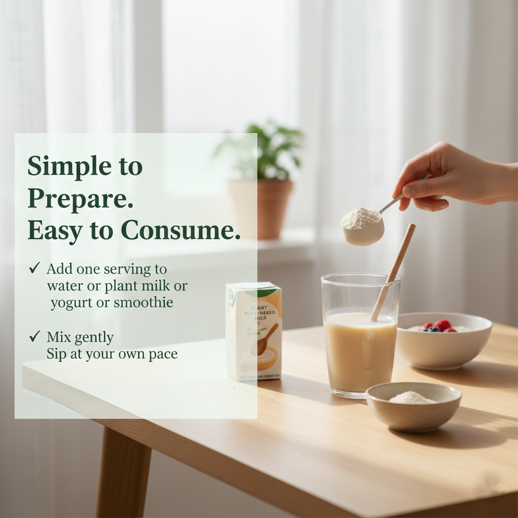 A gentle, plant-based nutrition option designed for: recovery periods, low appetite days, and sensitive digestion.