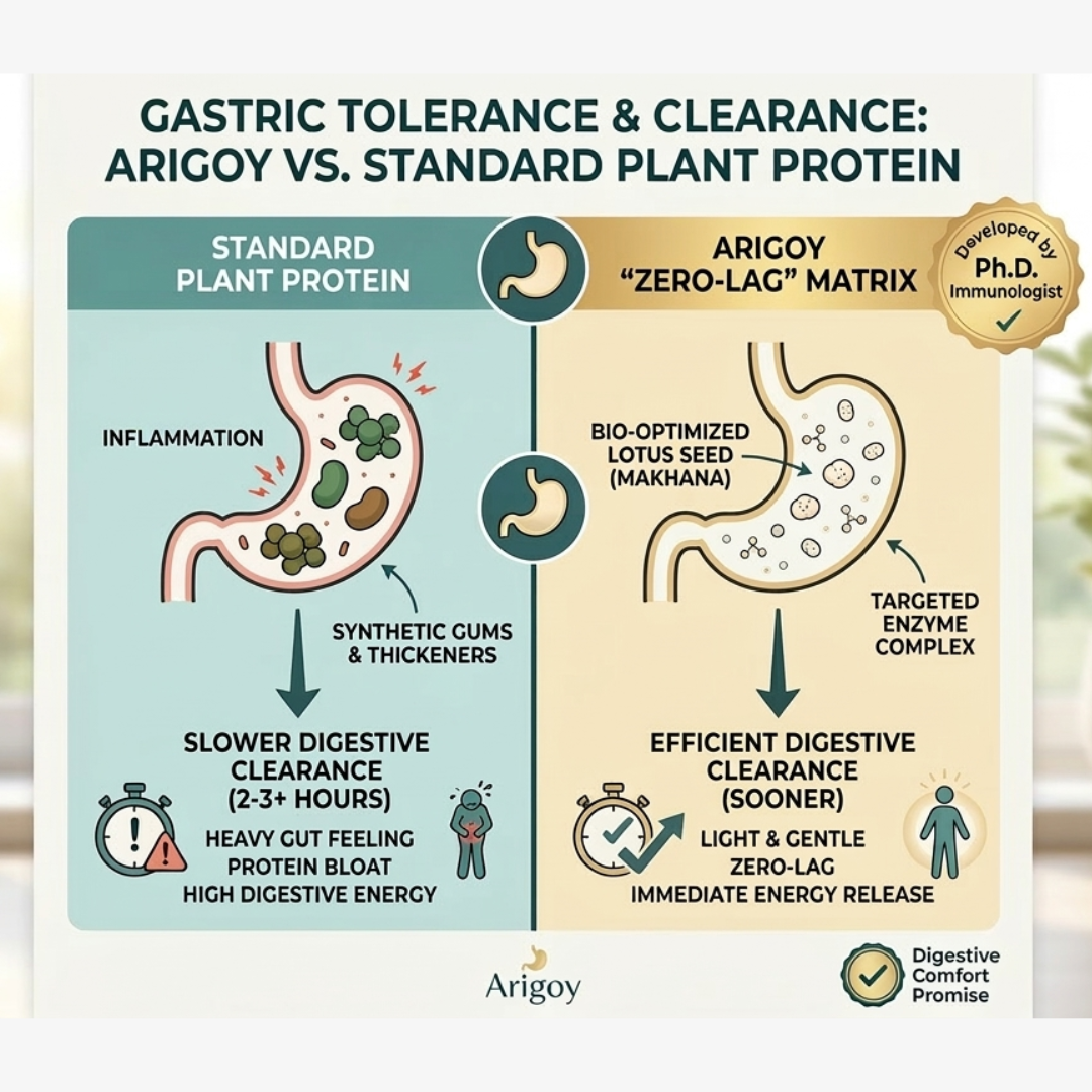 As a Ph.D. in immunology, I developed Arigoy because I saw loved ones struggle to keep standard nutrition down. We use the Arigoy Matrix (featuring Makhana) to act as a natural pH buffer, protecting the gut environment and ensuring nutrients are absorbed without friction.