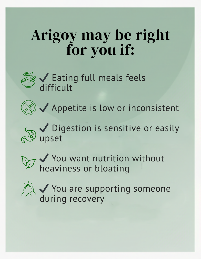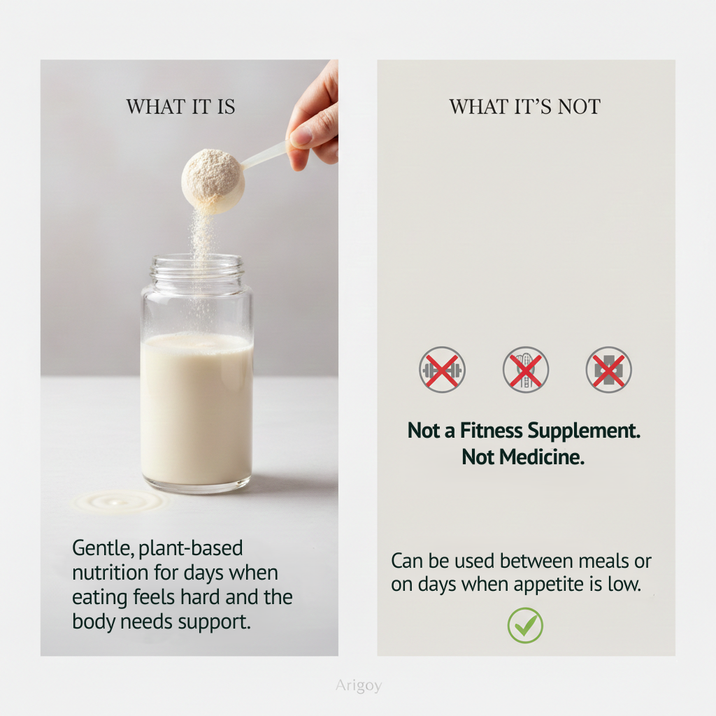Arigoy is a plant-based nutrition powder designed to be easy to drink and gentle on digestion - especially when appetite is low or eating full meals feels difficult.