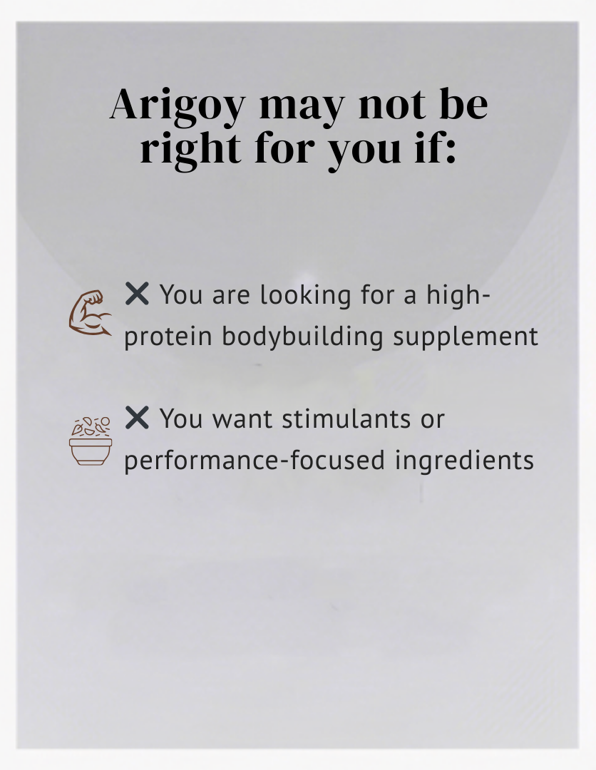 Arigoy is designed as balanced daily nourishment, not a single-ingredient product.