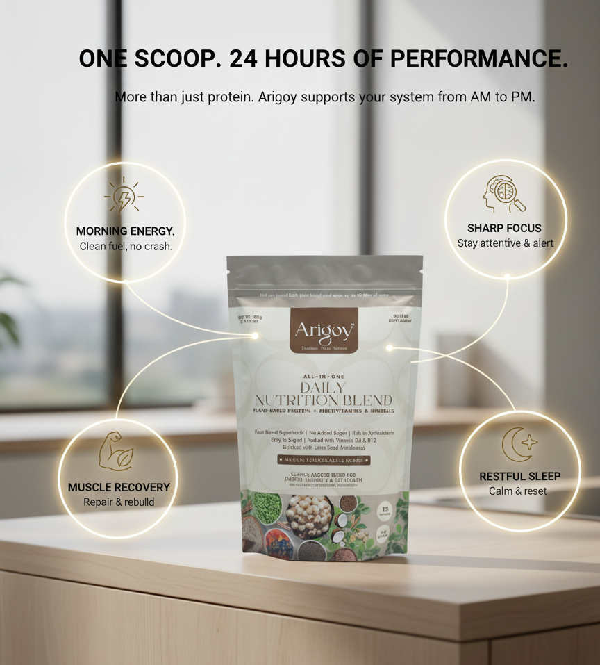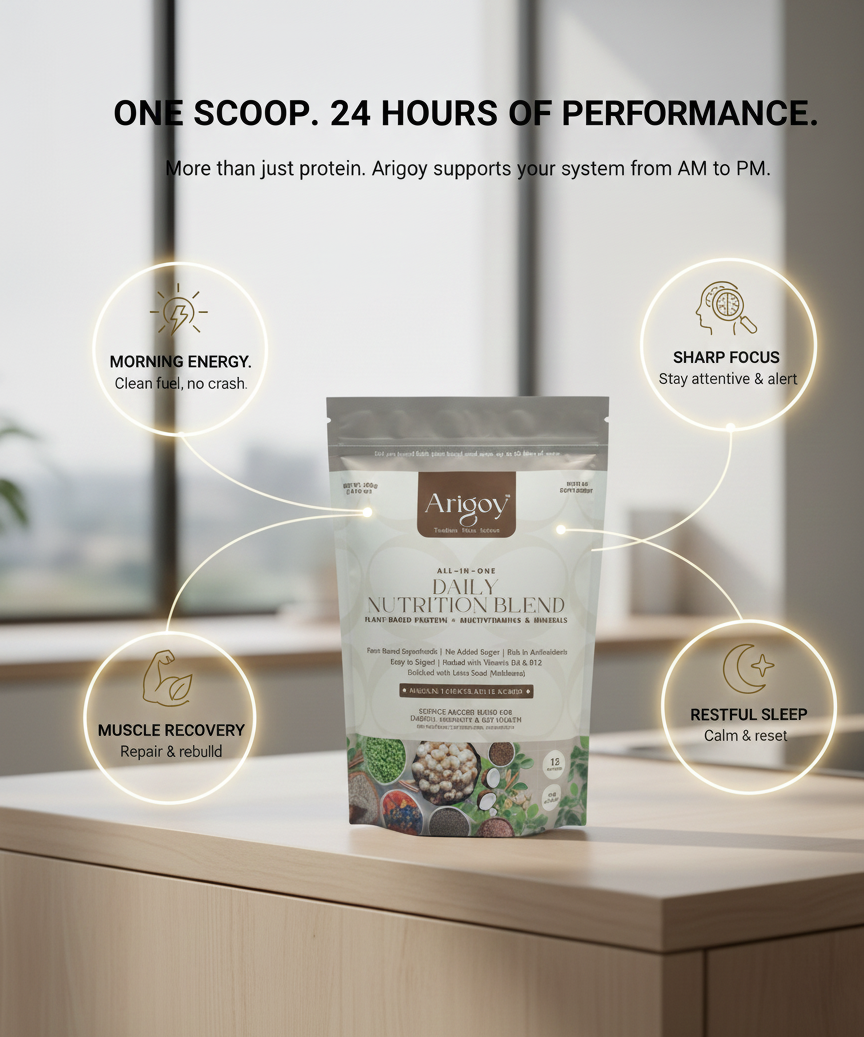 Arigoy's ALL-IN-ONE Daily Nutrition delivers comprehensive wellness in every serving. This plant-based protein powder combines 45+ science-backed superfoods with essential vitamins and minerals, including makhana and vitamin D3 for optimal nutritional support. Formulated to enhance energy metabolism, promote digestive health, strengthen immune function, and sharpen mental clarity, it's your complete daily nutrition solution. The warming turmeric latte flavor makes wellness both nourishing and enjoyable, fitting seamlessly into your everyday routine.